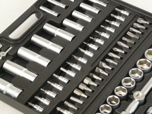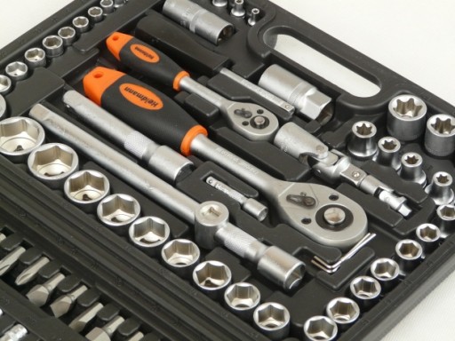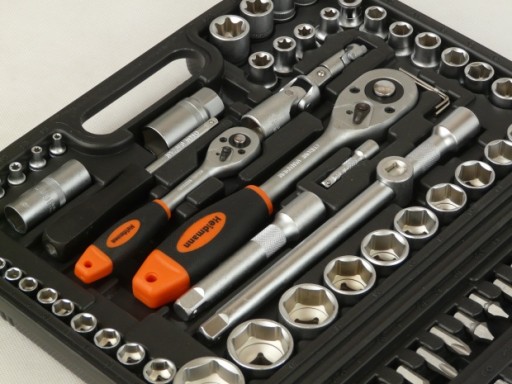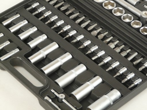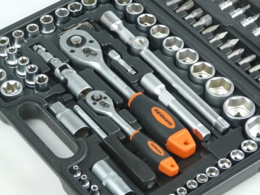 Zestaw kluczy marki Heidmann składający sie ze 108 elementów. Znaleźć w nim można pakiet nasadek i końcówek wkrętakowych oraz grzechotki 1/2" i 1/4" z 24 zębami. Zestaw zawiera bity na nasadki oraz dedykowany do nich wkrętak. Wszystkie elementy tego zestawu wykonane są z wysokiej jakości stali chromowo-wanadowej CrV. Całość umieszczona jest w poręcznej walizce wykonanej z wytrzymałego tworzywa sztucznego.