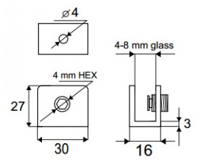 Opis: mocowanie wykonane jest z metalu i wykończone na wzór stali szczotkowanej. Podpórka jest wyposażona w wkręt umożliwiający pewne zamocowanie półki szklanej. Podpórkę mocuje się za pomocą jednego kołka do betonu lub wkrętu do drewna (w komplecie nie ma wkrętu mocującego wspornik do ściany). Bardzo dobra jakość wykonania gwarantuje pewną podporę półki. Maksymalna grubość półki mocowanej w uchwycie 8 mm.