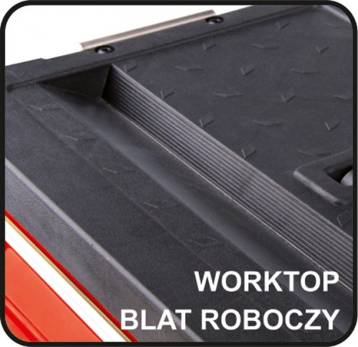 W skład zestawu wchodzi skrzynka dolna wyposażona we wbudowane kółka, teleskopową rączkę aluminiową oraz dużą szufladę uchylną.