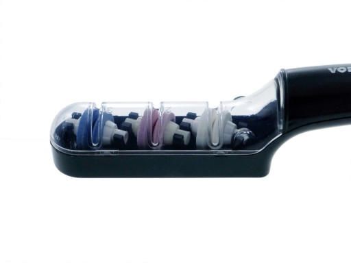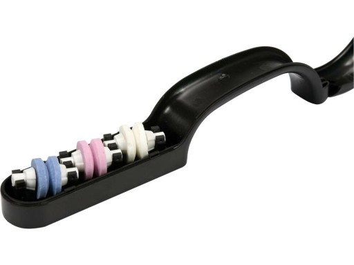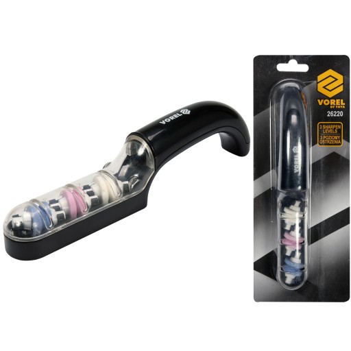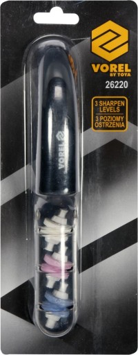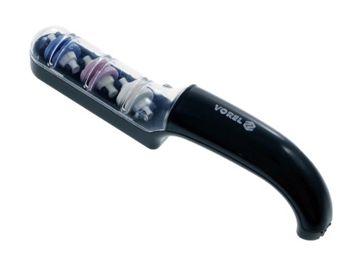 Ostrzarka z trzema podwójnymi tarczamio różnych twardościach przeznaczona do skutecznego ostrzenia noży i innych podobnych narzędzi. Korpus wykonany z odpornego na uszkodzenia tworzywa, pełni równocześnie funkcję zbiorniczka wody. Tarcze ścierne pracują "na mokro" zwiększając efektywność ostrzenia.