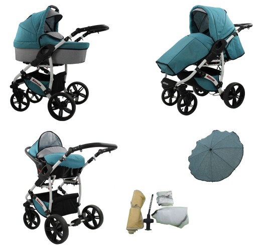 Wózek 3W1 na kołach skrętnych z fotelikiem samochodowym z możliwością blokady,parasolem,