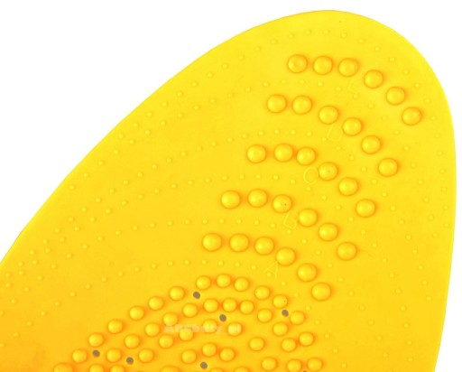 - Górna część wkładki pokryta jest specjalnymi wypustkami o zróżnicowanej wielkości, które skutecznie masują stopę podczas stawiania każdego kroku.