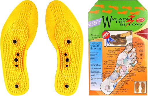- Wkładki wyposażone są w 10 MAGNESÓW LECZNICZYCH pozytywnie oddziaływujących na sprecyzowane receptory oraz obszary stopy.