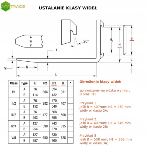 Standardowy kształt końcówki (zależny od szerokości ramienia wideł). Standardowa grubość końcówki 10 mm. Standardowa długość zbieżności zależna jest od grubości materiału,