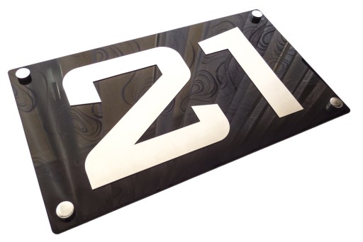 2-cyfrowa tablica z numerem na dom wykonana z najwyższej jakości czarnego szkła akrylowego o wysokim połysku i szczotkowanej stali nierdzewnej kwasoodpornej INOX, odpornej na warunki atmosferyczne.