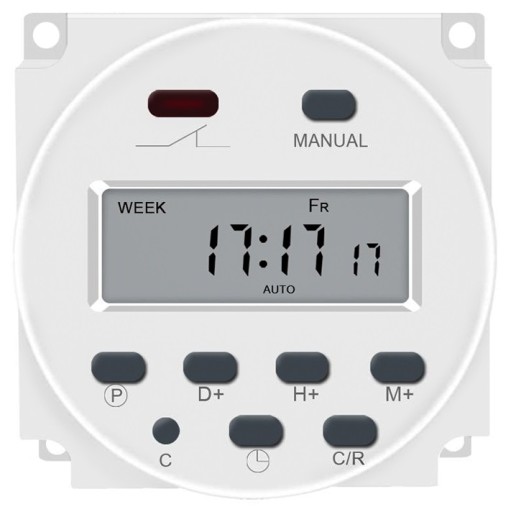 Cyfrowy sterownik czasowy na napięcie 12V AC/DC posiada szerokie zastosowanie do sterowania oświetleniem LED lub innymi urządzeniami wymagającymi określonego czasu pracy lub wybranych godzin załączania i wyłączania, np. klimatyzatorów, reklam świetlnych, kuchenek elektrycznych, opryskiwaczem w ogrodzie, urządzeniami nadawczo odbiorczymi, w maszynach, itp. Umożliwia zaprogramowanie działania dla 7 dni tygodnia. Sterownik posiada 16 programów a jego programowanie jest bardzo proste i intuicyjne. Każdy z dostępnych programów można ustawić niezależenie w które dni ma być dany program aktywny. Dodatkowo można ustawić kilka różnych programów na wymagany dzień lub dni. Sterownik posiada wiele różnych możliwości konfiguracji a w razie potrzeby można przejść na sterowanie ręczne przyciskiem MANUAL. Zapalona czerwona dioda sygnalizuje stan pracy załączenia przekaźnika (obwód wyjścia sterowania)