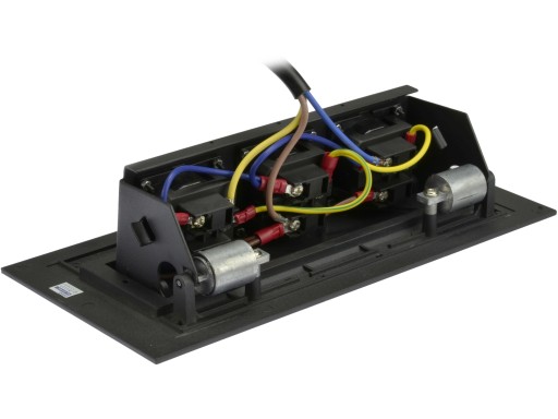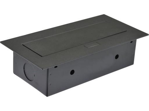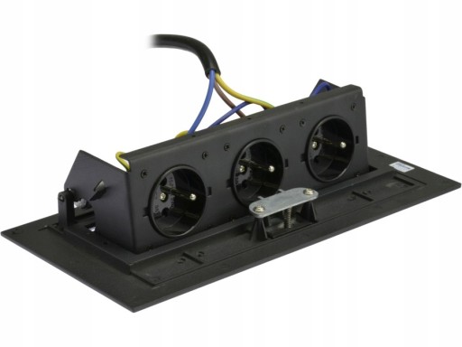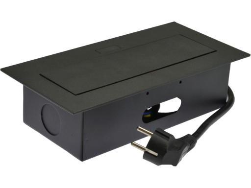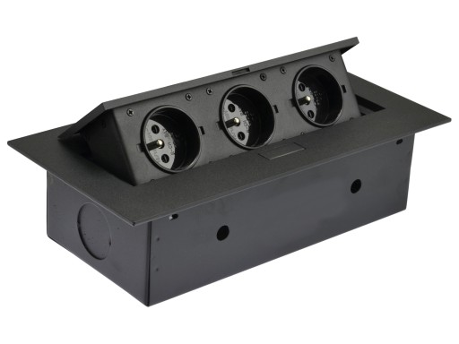 Zestaw trzech gniazd sieciowych 250V AC/16A z uziemieniem, przewodem 1,5m i wtyczką, w obudowie chowanej w blat. Przeznaczone do montażu wewnątrz pomieszczeń w biurkach, blatach (także kuchennych) i stołach, zarówno w pozycji pionowej jak i poziomej, zapewniając dostęp do gniazd elektrycznych. Gniazda wpuszczane w blat to rozwiązanie dedykowane do wszystkich nowoczesnych domów, biur oraz sal konferencyjnych.