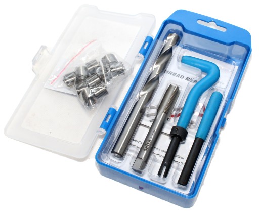 ✅ Zestaw do naprawy uszkodzonych gwintów w silnikach i innych elementach pojazdów. Wiertła i gwintowniki wykonane zostały ze stali szybkotnącej HSS. Gwintowniki jednostopniowe, nacinają gwint, w który wprowadza się wkładkę spiralną z twardej stali nierdzewnej. Do wprowadzenia wkładki służy pokrętło prowadzące, oraz wybijak, który obłamuje wystającą końcówkę wkładki.