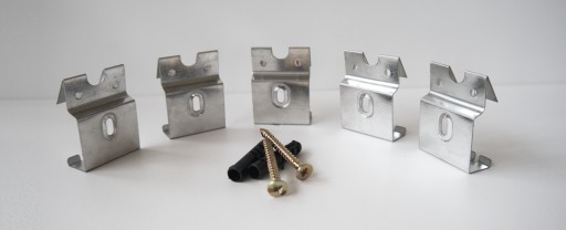 - Klamry są pakowane w zestawie z kołkami i wkrętami niezbędnymi do montażu.