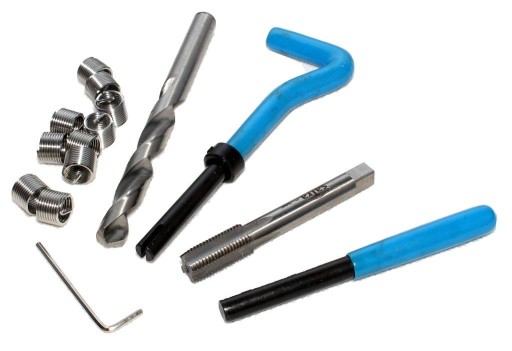 Zestaw do naprawy uszkodzonych gwintów w silnikach i innych elementach pojazdów. Wiertła i gwintowniki wykonane zostały ze stali szybkotnącej HSS. Gwintowniki jednostopniowe, nacinają gwint, w który wprowadza się wkładkę spiralną z twardej stali nierdzewnej. Do wprowadzenia wkładki służy pokrętło prowadzące, oraz wybijak, który obłamuje wystającą końcówkę wkładki.