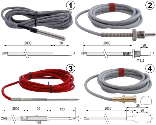 - Czujnik z gwintem 1/4" np: wkręcany za pomocą redukcji w instalacje C.O., C.C.W lub C.W.U