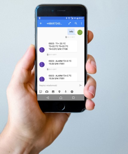 Każdy użytkownik znający numer telefonu urządzania wysyłając komunikat SMS o treści Info otrzyma wiadomość zwrotną z wartościami temperatur na każdym z czujników.