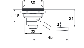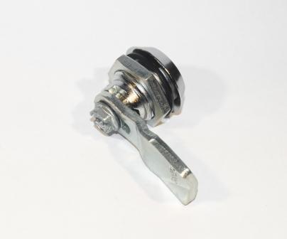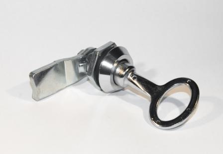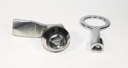 Opis: wysokiej jakości zamek wykonany z metalu w kolorze ocynk srebrny. Czoło zamka widoczne od strony klucza jest niklowane. Elementem zamykającym jest metalowy języczek (rygiel). Języczek po przekręceniu klucza przesuwa się o 90 stopni. Zamek jest blokowany nakrętką montażową. Języczek nasadzony jest na trzpieniu w kształcie kwadratu i mocowany jest do korpusu zamka śrubą. Zamek jest mocną, solidną konstrukcją. Języczek zamykający ma 4 mm grubości. Zamki te można stosować w szafach energetycznych, włazach technicznych w sprzęcie budowlanym, kolejowym, okrętowym itp.