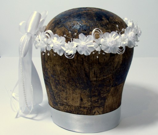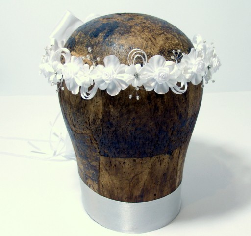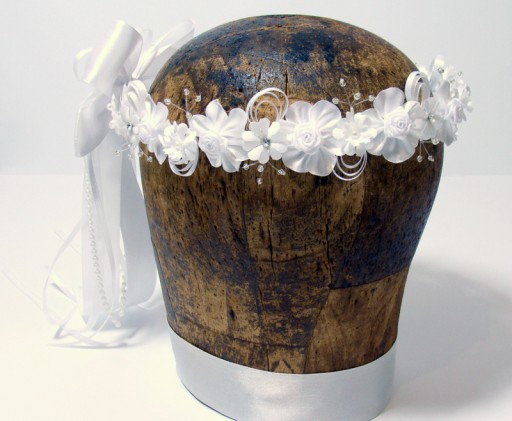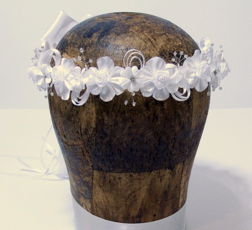 Wianek Agatka to kompozycja atłasowych elementów - różyczek, kwiatków, okółków, konwalii . Całość zdobią srebrne koraliki na żyłkach, dżety i atłasowe pawie oka.