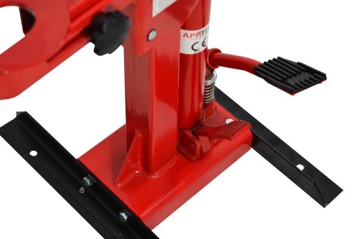Podczas naciskania dźwigni nogą, zamocowana sprężyna zostaje ściśnięta w celu zmontowania lub rozmontowania kolumny McPherson.