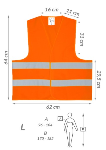 Rozmiary kamizelek np. L, XL itd. nie stanowią stałego rzeczywistego rozmiaru. W zależności od producenta lub dostawcy ten sam rozmiar może mieć inne wymiary. Dlatego przy każdej kamizelce podajemy rzeczywiste wymiary obrysu rozłożonej kamizelki.