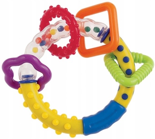Grzechotka przeznaczona dla najmłodszych dzieci. Lekka, łatwa do utrzymania w małych rączkach, idealna jako pierwsza grzechotka. Różnorodne kształty i kolory zachęcają maluszka do ćwiczeń i zabawy, stymulując jego rozwój. Wprowadzają dziecko w świat dźwięku, ruchów i pięknych barw. Grzechotka jest wykonana z trwałych i bezpiecznych materiałów. Nie posiada ostrych krawędzi.