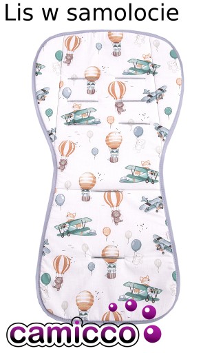 Idealnie pasuje do większości wózków dziecięcych dostępnych na rynku. Wkładka wykonana jest z bawełny 100% która zapewnia odpowiednią cyrkulację powietrza pomiędzy ciałem Dziecka a wózkiem w którym siedzi, pod nim wszyta jest mięciutka pianka, pod spodem obszyta podszewką