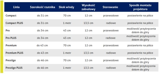 Szeroka oferta produktów, szytych na miarę różnych projektorów i potrzeb, umożliwia Ci wybór najbardziej optymalnego rozwiązania. Możesz wybierać m.in. pod kątem sposobu montażu projektora (posadowienie na półce lub przykręcenie do góry dołem), wysokości skoku windy czy też wielkości projektora.