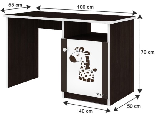 Biurko wykonane jest z płyty wiórowej, o grubości 18 mm. Posada funkcjonalną szafkę montowaną na zawiasach, w której umieszczona jest jedna półeczka, dodatkowo biurko posada jedną odkrytą półkę, tuż pod blatem.
