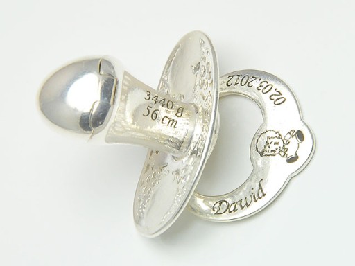 Przykładowe wykonanie smoczka z grawerunkiem znajduje się na zdjęciu obok.