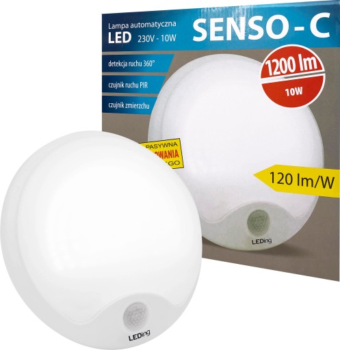 SENSO-C to plafon wyposażony w stałe źródło światła LED. W stosunku do tradycyjnych rozwiązań, jego stosowanie zapewnia oszczędność energii sięgającą 90%. Dzięki zastosowaniu technologii LED SMD zagwarantowana zostaje bezawaryjność i bezpieczeństwo. Komfort zapewniają czujnik ruchu typu PIR i czujnik zmierzchu, dzięki którym oprawa uruchamia się tylko wtedy, gdy światło jest rzeczywiście potrzebne. Czujnik zmierzchu zadba o to, by oprawa przechodziła w stan czuwania dopiero wówczas, kiedy ilość światła dziennego jest niewystarczająca. Umiejscowienie czujnika PIR z boku pozwala na optymalizację obszaru wykrywania ruchu. Ruch wykrywany jest dookolnie z odległości około 7 metrów, a światło gaśnie po opuszczeniu strefy detekcji ruchu (opóźnienie ok 40 sekund).