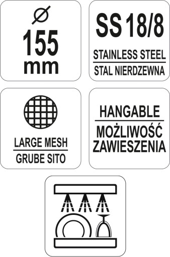 Zewnętrzna średnica cedzaka wynosi 155mm. Natomiast wzmacniana rękojeść z uchwytem o długości 33cm wykonana jest z drutów o grubości 4mm. Dzięki temu łyżka jest bardzo wytrzymała. Cedzak posiada grube oczka o rozmiarze: 6mm x 6mm.