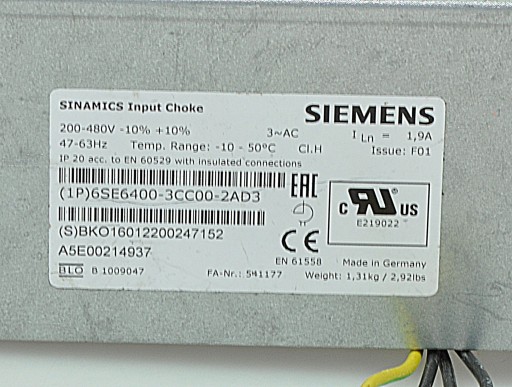 Nie używany 6SE6400-3CC00-2AD3 SINAMICS Input Choke filtr do falowników, prąd 1,9A.
