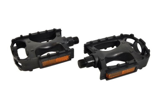 Uniwersalne pedały, plastikowe, w kolorze czarnym. Dla zwiększenia bezpieczeństwa rowerzysty są wyposażone po obu stronach w odblaski - kolor pomarańczowy. Posiadają wbudowane metalowe łożysko. Pokryte antypoślizgowym bieżnikiem.