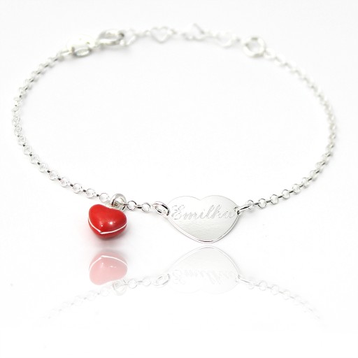 Srebrna Bransoletka Dziecięca z CZERWONYM SERCEM i sercem do GRAWERU
