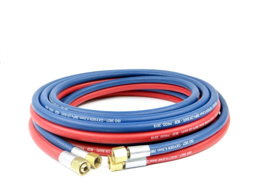 Profesjonalnie okuty wąż gumowy DUET do acetylenu i tlenu firmy GCE. Wyposażony w standardowe złącza które pasują do wszystkich reduktorów oraz palników. Stosowany w spawalnictwie do przepływu acetylenu i tlenu przy spawaniu, cięciu płomieniowym metali oraz podgrzewaniu, opalaniu i lutowaniu. Wąż gumowy jest bardzo giętki, lekki, zachowuje elastyczność w niskich temperaturach, jest odporny na wysokie ciśnienie, zagniecenia, ścieranie, starzenie nie pęka. Wąż spełnia wymagania normy EN-559,ISO 3821. Pierwsza klasa węża. Rok produkcji węża 2022 r.