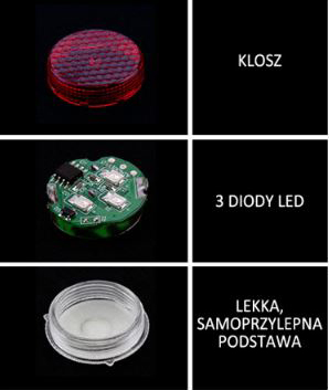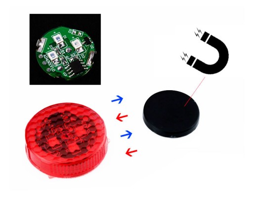Na każdą lampkę przypada jeden magnes, również z taśmą samoprzylepną. Gdy magnes przylega do lampki, układ nie uruchamia diod LED. Diody LED świecą tylko wtedy, gdy magnes znajduje się w odległości większej niż 3 centymetry od lampki. To rozwiązanie maksymalizuje czas pracy lampki na jednej baterii.