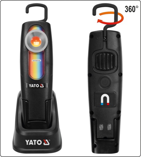 - Obrotowa obudowa umożliwia pochylenie lampy pod dowolnym kątem. Dzięki tej funkcji oraz dodatkowo dwóm magnesom i obrotowemu haczykowi można ją łatwo i elastycznie zamocować. Daje to możliwość optymalnego oświetlenia pożądanej przestrzeni, pozostawiając wolne ręce.
