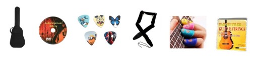 POKROWIEC, PASEK, KURS DVD, KOLOROWE KOSTKI DO GRY, NAKŁADKI SILIKONOWE NA PALCE ORAZ KOMPLET STRUN ZAPASOWYCH