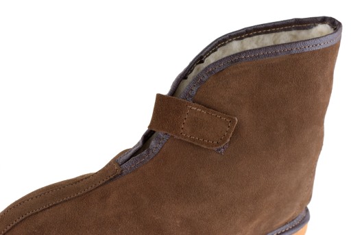 Bambosze zapinane na rzepkę, model unisex. Produkt wykonany z wysokiej jakości skóry welurowej. Środek wyścielony jest dzianiną futerkową. Podeszwa wykonana jest z tworzywa sztuczengo, która jest również odporna na ścieranie. Bambosze idealne na długie zimowe wieczory.