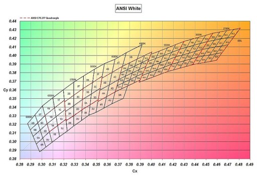 Poniżej wykres barwy światła w standardzie ANSI C78.377-2008