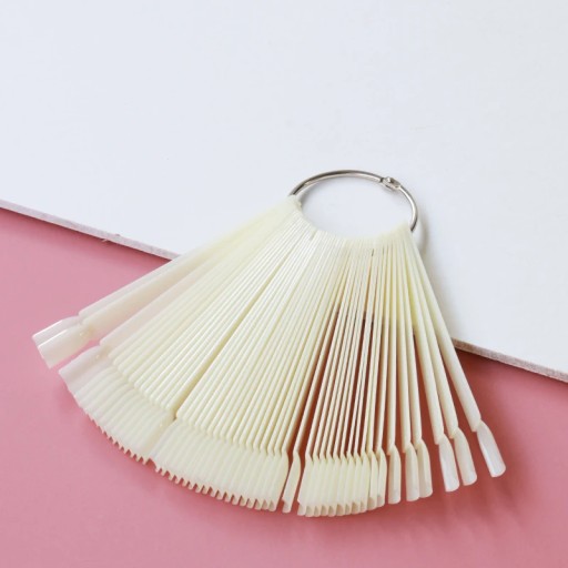 Praktyczny wzornik lakierów z 50 tipsami w kolorze mlecznym. Próbnik w formie wachlarza na metalowym kółku. Będzie bardzo pomocny podczas wybierania koloru lakieru lub wzorku na paznokcie. To bardzo czytelna, wygodna oraz estetyczna paleta do malowania lakierami klasycznymi, hybrydowymi lub żelami. Wzornik jest poręczny, solidnie wykonany, przydatny w każdym salonie kosmetycznym.