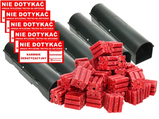 Najbardziej efektywny zestaw do usuwania myszy i szczurów - Karmnik deratyzacyjny 5 sztuk - w zestawie 500 gramów super mocnej trutki RATIMOR w formie kostki oraz 5 naklejek informacyjnych: