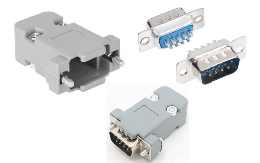 Kompletna wtyczka DB9 męska (9 pin) z obudową plastikową do skręcania.