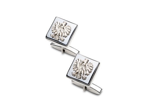 Spinki męskie do mankietów wykonane z polerowanego srebra próby 925 oraz hematytu. Spinki zdobi wizerunek naszego godła państwowego - orła w koronie. Orzełki wykonane są również ze srebra 925.