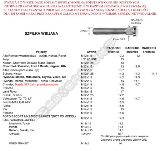 - OFERTA DOTYCZY SZPILEK O WYMIARACH: