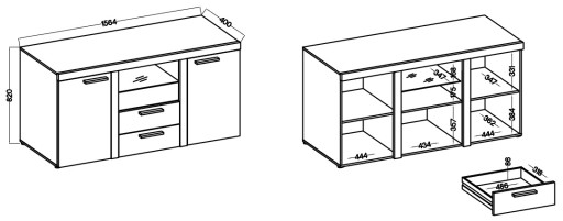 Meblościanka z komodą wykonana z płyty laminowanej o podwyższonej wytrzymałości w uchwyty kolorze srebrnym .