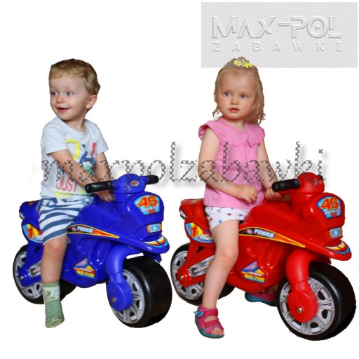Stylizowane naklejki dodają zabawce sportowego charakteru. Mały kierowca wsiadając na swój motor będzie się czuł jak prawdziwy motocyklista. Duże i solidnie wykonane koła powodują, że motorek jest bardzo stabilny - postawiony nie przewraca się. Bez problemu dziecko będzie poruszać się w domu i na podwórku. Szerokie opony pozwolą na jazdę po chodniku, trawniku, a nawet po piasku. Wygodne siedzisko zapewni swobodę poruszania się i bezproblemowe wsiadanie i zsiadanie z motoru. Widelec przedni skrętny.