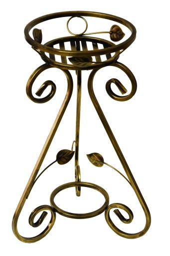 Polskiej produkcji kwietnik, stabilny i solidny, stojak wykonany z metalu w kolorze starego przetartego złota, posiada jedną dużą i solidną podstawę na donice o rozmiarach dolnych maksymalnie fi 19 cm, jest praktyczny jako stojak na kwiaty, jak i dzięki perfekcyjnie wykonanym detalom zdobi i upiększa każde wnętrze.