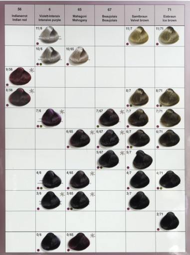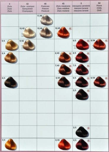 Odcienie zawierające pigment P5 (zwiększający intensywność koloru występuje w odcieniach miedzianych, mahoniowych, czerwieniach i fioletach na karcie kolorów zaznaczone gwiazdką)