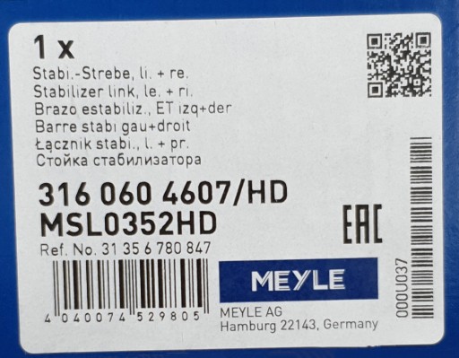 - Przedmiot: Zestaw dwóch łączników stabilizatora wraz z gumami firmy MEYLE HD