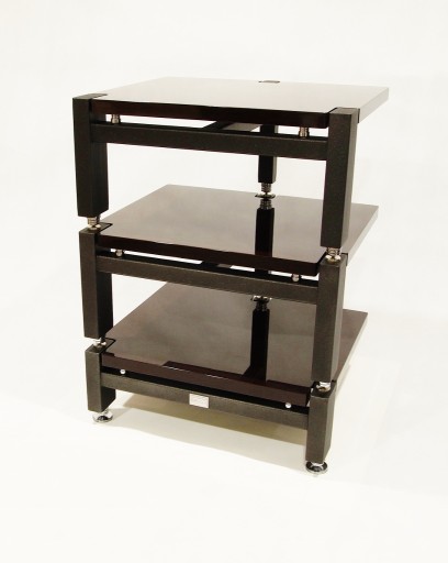 Stolik antywibracyjny dla trzech urządzeń audio. Stolik trzypoziomowy, modułowy, trójnożny, podstawa w kształcie trójkąta. Stelaż stolika wykonany ze stali konstrukcyjnej o podwyższonej wytrzymałości. Łączenie poszczególnych elementów stelaża wykonane poprzez spawanie zewnętrzne, na całym obwodzie łączonego elementu.