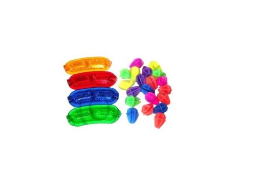 Zestaw zawiera 20 koralików w różnych kolorach oraz 4 odblaski - niebieski, czerwony, pomarańczowy i zielony. (pokazane na zdjęciach)