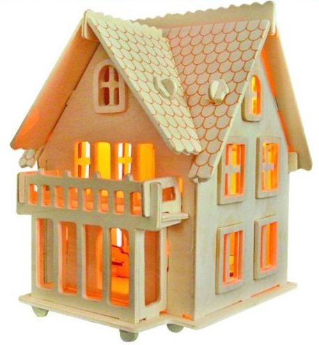 Domek wykonany jest ze sklejki drewnianej z gotowych powycinanych elementów do własnoręcznego montażu według rysunku poglądowego.W celu utrwalenia budowli można podkleić go klejem do drewna i pomalować według własnej fantazji.
