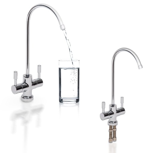 - Kran w nowoczesnym stylu z dwoma kranikami. Wykonany jest z najwyższej jakości materiałów, co gwarantuje komfort użytkowania oraz niezawodność. Dzięki dwóm kranikom możliwe jest nalanie wody po osmozie lub zmineralizowanej.